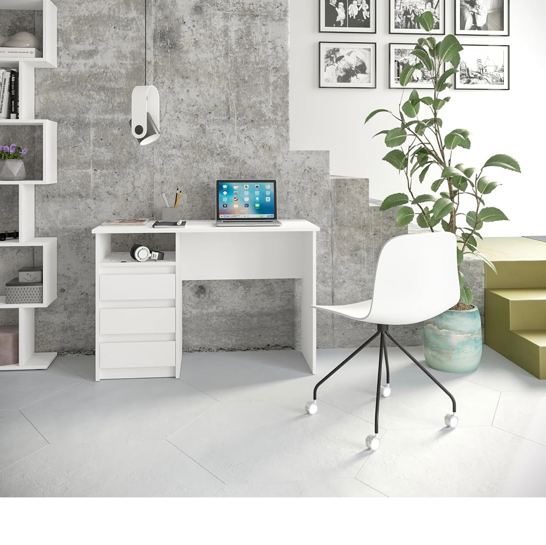 - Petit bureau blanc compact avec tiroirs spacieux, idéal pour maintenir un espace de travail ordonné dans tout intérieur