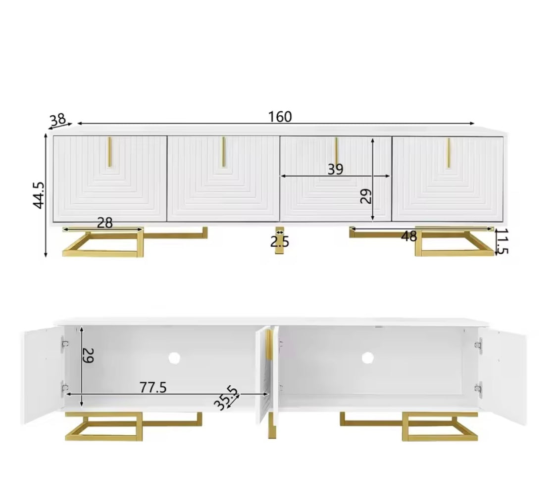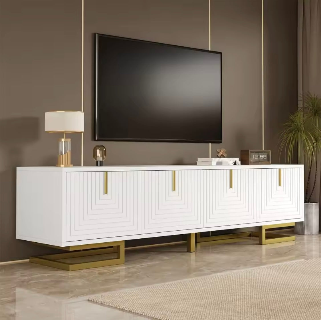 - Rangement Optimisé 4 Portes Intégrées: Avec ses quatre portes équipées d'étagères internes, ce lowboard offre un espace de stockage généreux et organisé pour tous vos équipements multimédias et accessoires décoratifs.